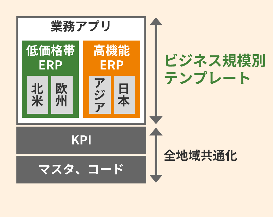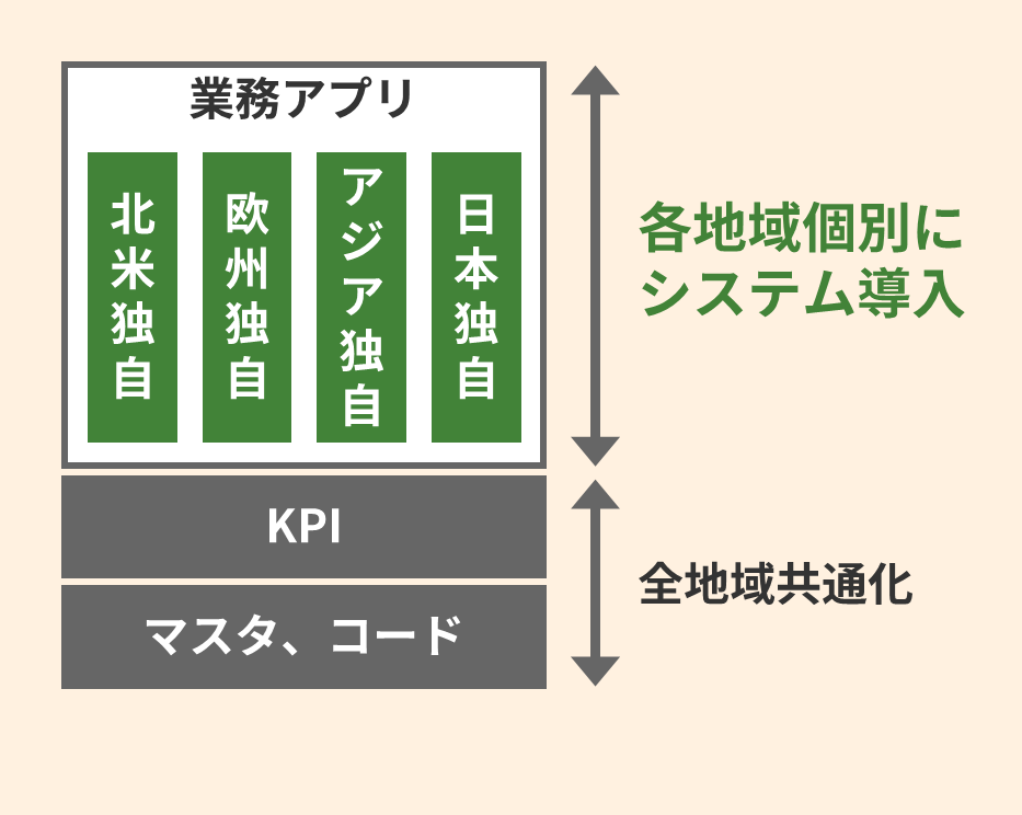 そういった場合は、グローバルでの計数管理のため、マスタやコードとKPIの標準化を行うものの、業務アプリに関しては、各地域個別のシステムを入れるだけ十分だと考えます。