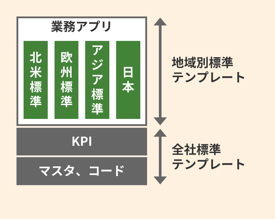 | マスタ、コードを標準化 | 業務アプリは、各地域で別々のものを利用するが、データドリブン経営の実現のため、マスタやコードに関しては、グローバルで標準化 |