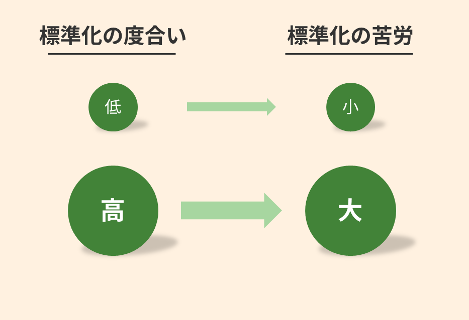 ひとつ言えることは、目指す標準化の度合いが大きければ大きいほど、標準化のための苦労も大きいということです。