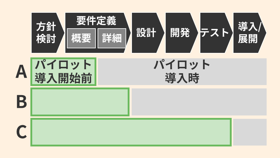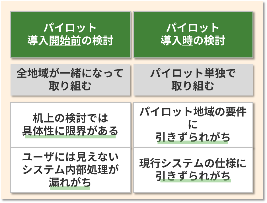 それは、パイロット導入の開始前(全地域での取組み)と開始後(パイロット単独での取り組み)とには、それぞれデメリットがあるからです。