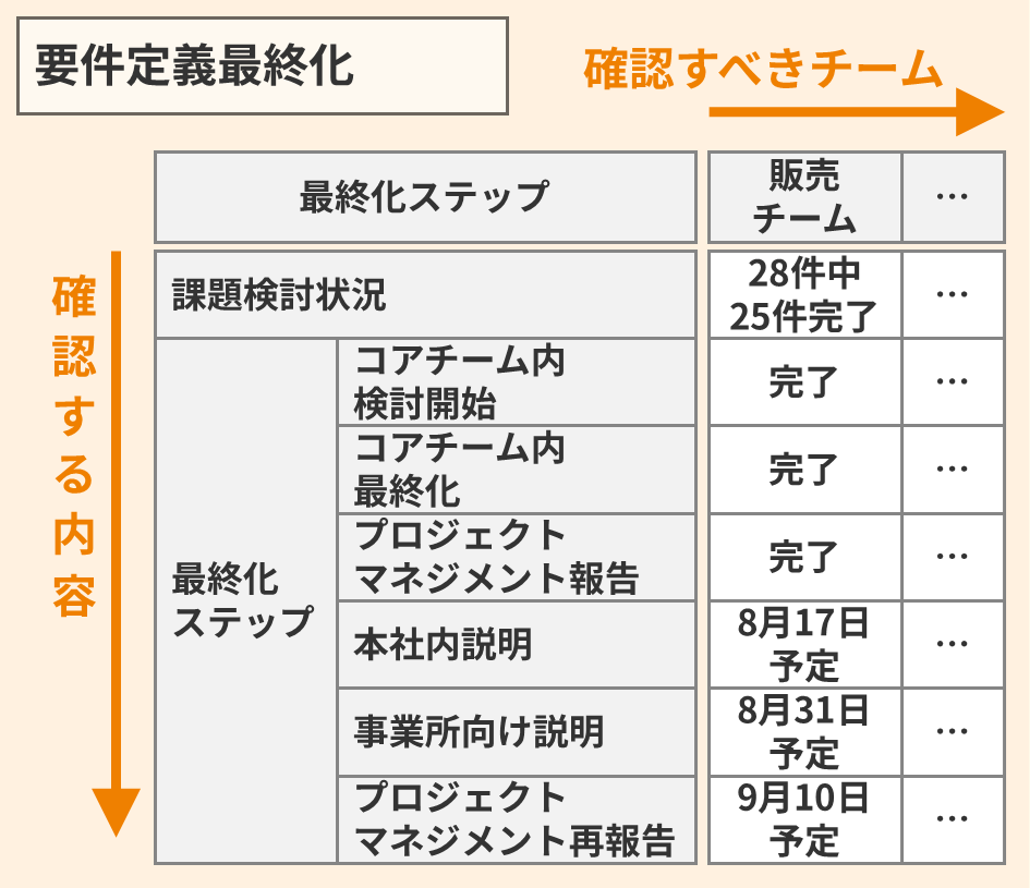 要件定義を最終化するために完了させるべきものについて、チームごとのステータスを整理