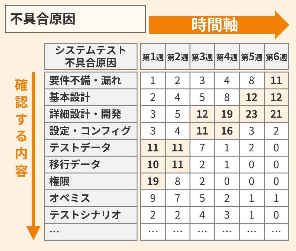 上記のように、時間軸を足していくと、システムテストの進捗に応じて、徐々に不具合原因も変わってきていることが分かります。それにより、そのときそのときに適した対策が打てるようになります。