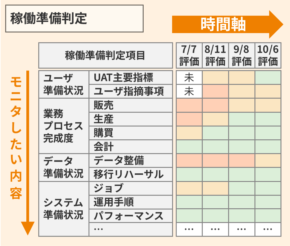カットオーバーに向けて、本番稼働できる準備が整ってきているかを確認するための判定リスト