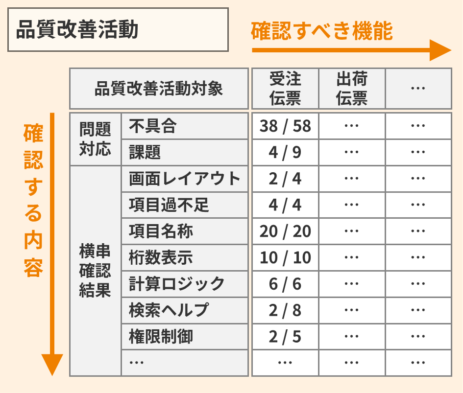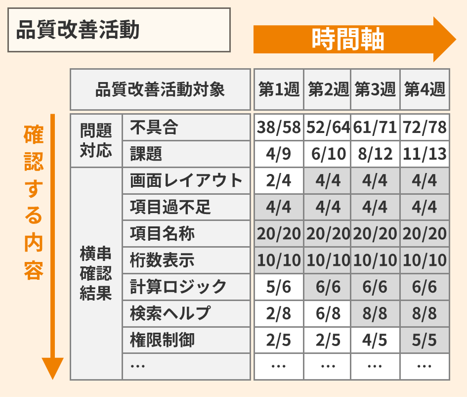 システムテストなどでは、不具合が大量発生してしまい、代替的な品質改善活動が進められることがあります。そういった場合には、以下のような表を作成して、状況を一望にすることがよくあります。
