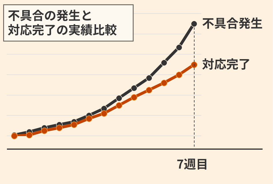 不具合発生件数の伸びに対して、対応完了件数が全く追い付いていない。
