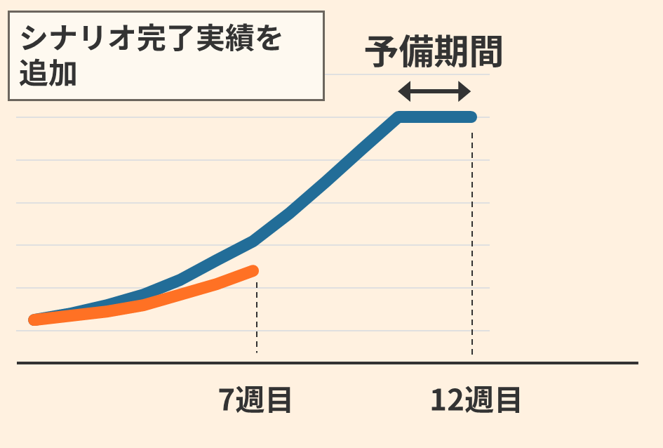 10週目までに全シナリオ完了予定だが、そのあと、2週間の予備期間がある。