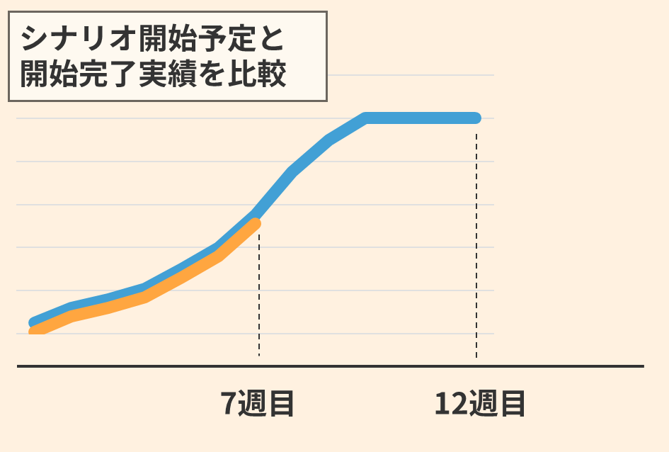 [着地予想] 7週目までの実績をもとに、傾向(=週当たりのシナリオ完了本数)を計算して、完了予定日をシミュレーションする。