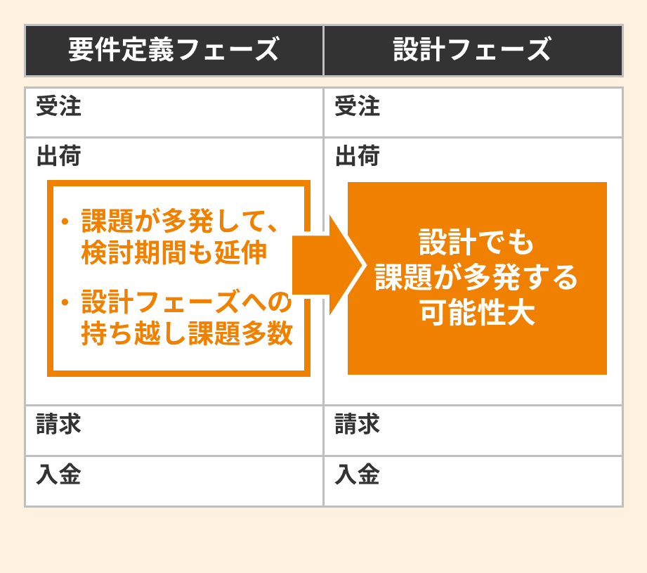 - 要件定義フェーズ中にすべての検討項目を検討完了できず、設計フェーズに持ち越した場合は、本来決まっているべき業務要件が決まっていないため、関連設計で手戻りのリスクが発生する