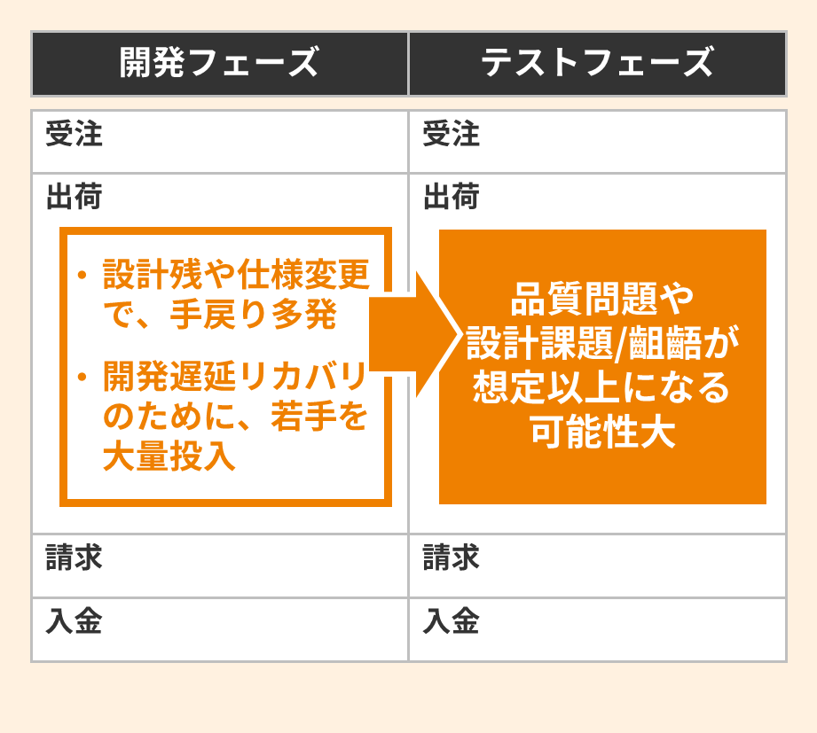 - 設計残や仕様変更で手戻りが多発している場合、必要な品質が維持できずに、テストフェーズで品質問題が起きる