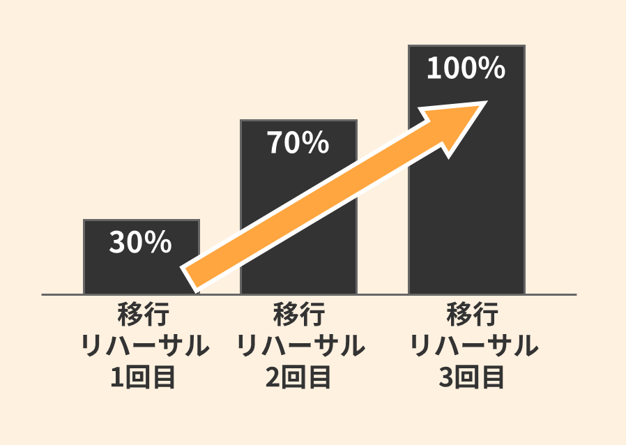 その母数を100%として、移行リハーサルごとに、合格品質となったデータの割合が100%に近づいているかをモニタしていくことになります。