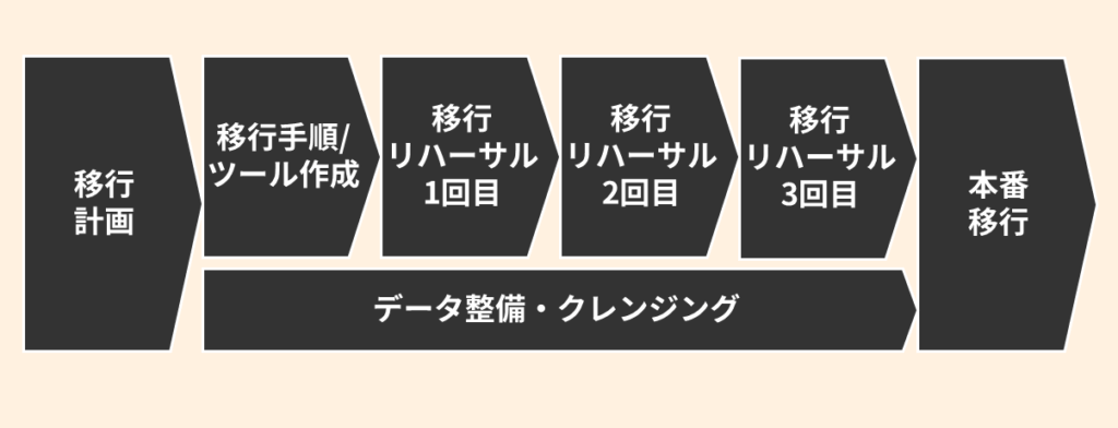 データ移行は、仕事の仕方も違います。下記は、一般的なデータ移行に関するタスクですが、要件定義・設計開発・テストといった業務・アプリチームの仕事の進め方とは大きく異なります。