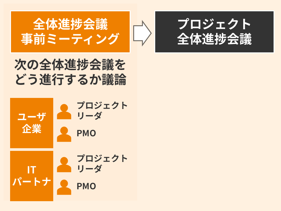 そのため、多くのプロジェクトでは、事前ミーティングを持ち、ユーザ企業とITパートナの双方のプロジェクトリーダが膝詰めで、毎週の全体進捗会議で、何を話すか、何を議論すべきかを話し合います。