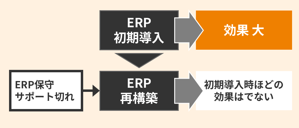 多くのERPにおいては、提供バージョンごとに保守期限があり、その保守期限までに新しいバージョンで再構築することが求められます。そのため、ユーザ企業は、否応なくERPを再構築するしかないのですが、初回導入時ほどの効果がないことがほとんどです。