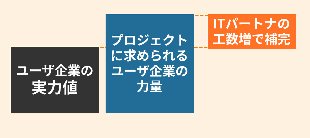 そういった無理なチャンレンジをする企業の多くは、やる気は十分です。大きな予算を投下する覚悟も十分です。そのため、実力値の足りないところを、ITパートナの要員アサインで補完しようとします。