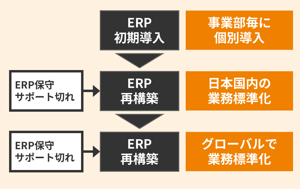 もう30年以上に渡ってERPを利用している企業も多いですが、そういった企業は、何回かERPの再構築を行っています。