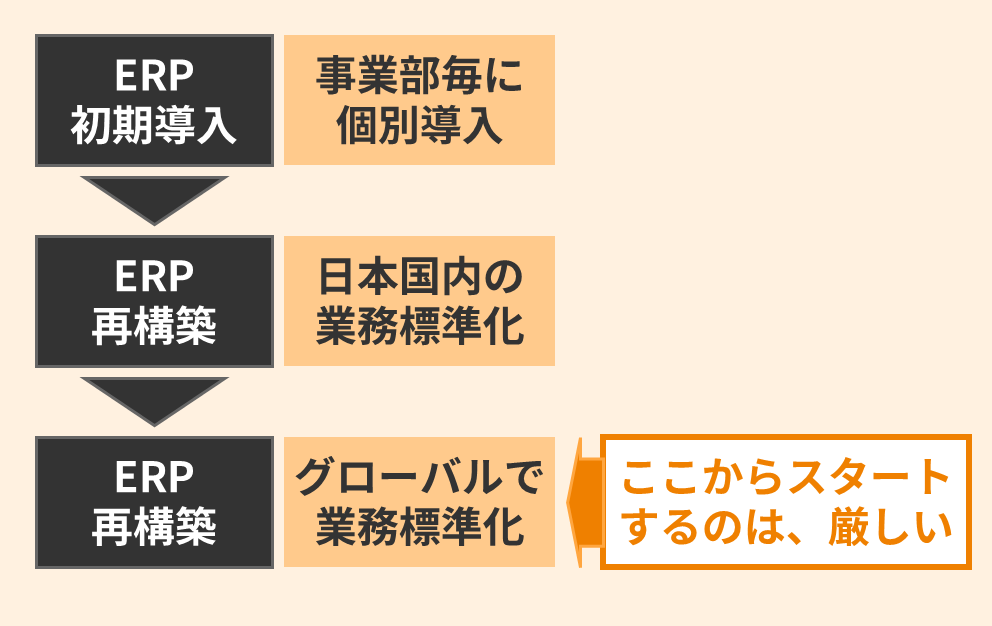 一般的には、段階的により難易度の高い取り組みにチャレンジするケースが多いです。上記の例では、業務標準化の範囲を、事業部ごと ➡ 日本国内 ➡ グローバルへと拡大していっています。