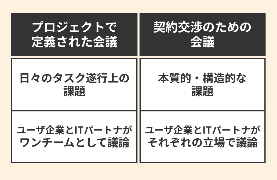 一方で、契約交渉のための会議は、通常のプロジェクトの会議とは異なり、ユーザ企業・ITパートナのそれぞれの立場で意見を交わす場です。つまり、多少の軋轢は生じるかもしれないが、普段は議題にしづらいトピックを持ち込める場なのです。