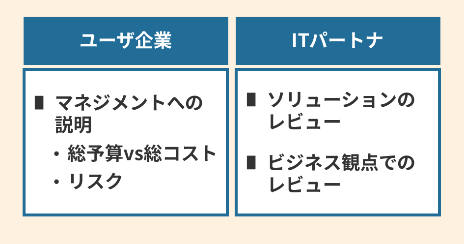 | 役割分担 | ユーザ企業とITパートナの責任範囲が明確化できていないと、発生費用の帰属について合意できない |