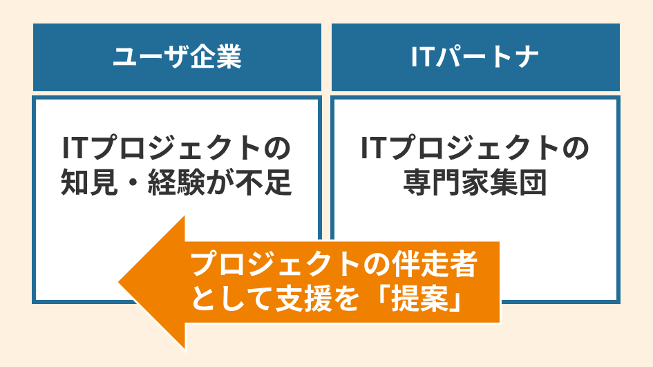ユーザ企業は当然「このITパートナだったら、プロジェクトが難局に直面しても、色々と支援してくれそうだ」と期待して、ITパートナを選んでいます。ITパートナも、それを期待して「伴走者」といったフレーズを提案書に入れてきます。