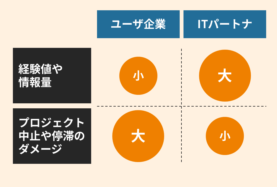 過去のプロジェクト経験や、プロジェクトに関する情報量などでは、ITパートナが格段に多くを持っています。また、契約交渉が決裂して、プロジェクトが中止や停滞したときのダメージも、ユーザ企業の方がはるかに大きいです。なぜなら、不退転の覚悟で、全社DXプロジェクトをやっている場合などは、止めるわけにいかないからです。