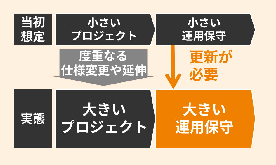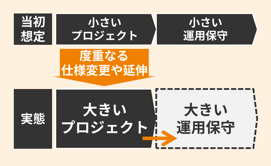 さて、今回取り上げたい状況は、度重なる仕様変更や延伸などによって、もともとは小さいプロジェクトを想定していたところ、段々とプロジェクト規模が大きくなってきているケースです。
