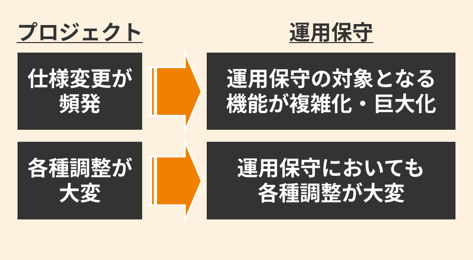 仕様変更をたくさん申請することも、検討会に時間がかかることも、多くは、業務メンバに起因します。業務メンバは、少しでも良いシステムを作りたいという気持ちから、機能を何度も見直し、検討会にも時間をかけます。