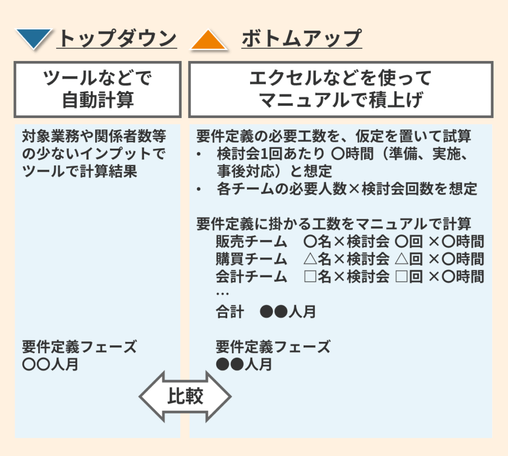トップダウン見積では、対象業務や打合せすべき関係者数などの少ないインプットで、工数を計算します。一方で、ボトムアップ見積では、もう少し前提を細かく置いて見積もります。