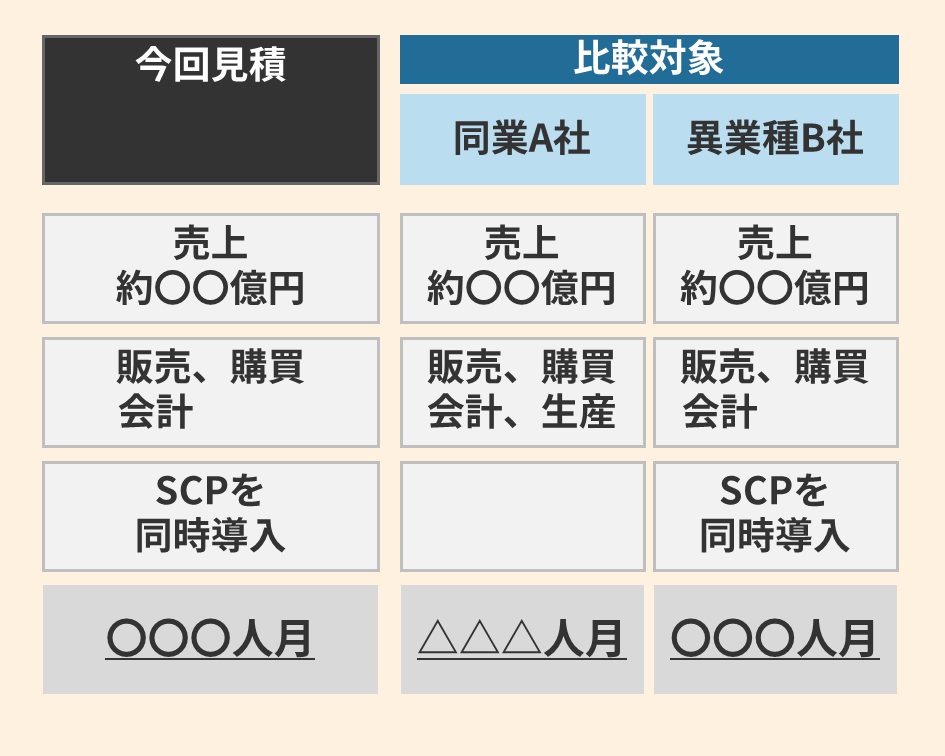 他の精査の仕方としては、類似事例の工数と比較するのも有効です。