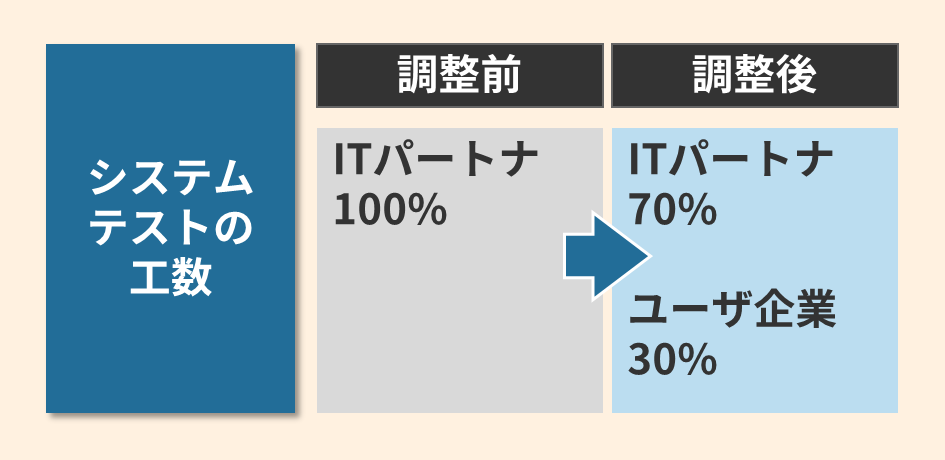 こちらは、全体の工数は減らさないので、作業対象は変わりません。一方で、一部の役割が、ユーザ企業に移りますので、ユーザ企業で工数の確保が必要であることに納得して貰わなくてはいけません。