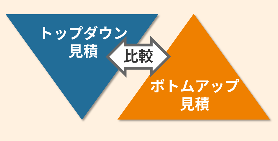 そうして出したボトムアップ見積の工数と、トップダウン見積の工数を比較します。差異が無ければ、算出された工数は妥当である可能性が高いです。差異が大きい場合は、その差異の原因を深掘りしていき、差異が小さくなるように、見積前提を変えていきます。