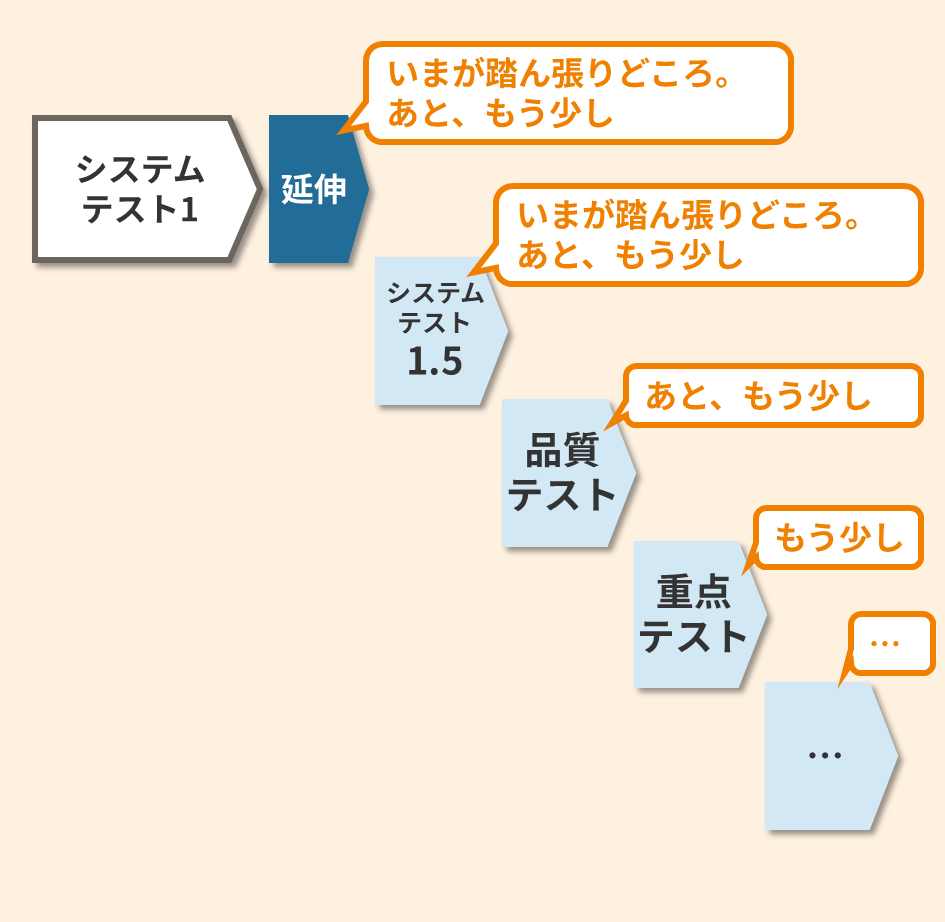 皆さんも感じられているように、こういうときは、うまく行きません。結果として、延伸を繰り返していくことになります。